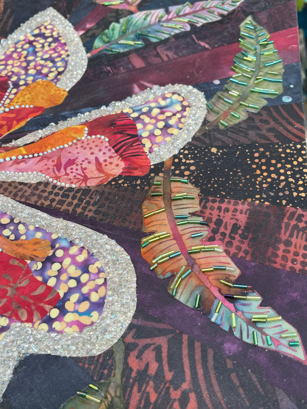 Midnight Unfolding is a textile mixed media artwork that reflects depth, stillness, and the quiet unfolding of form within shadow. Floral elements emerge from a darker palette, their layered fabrics creating subtle contrast and movement.