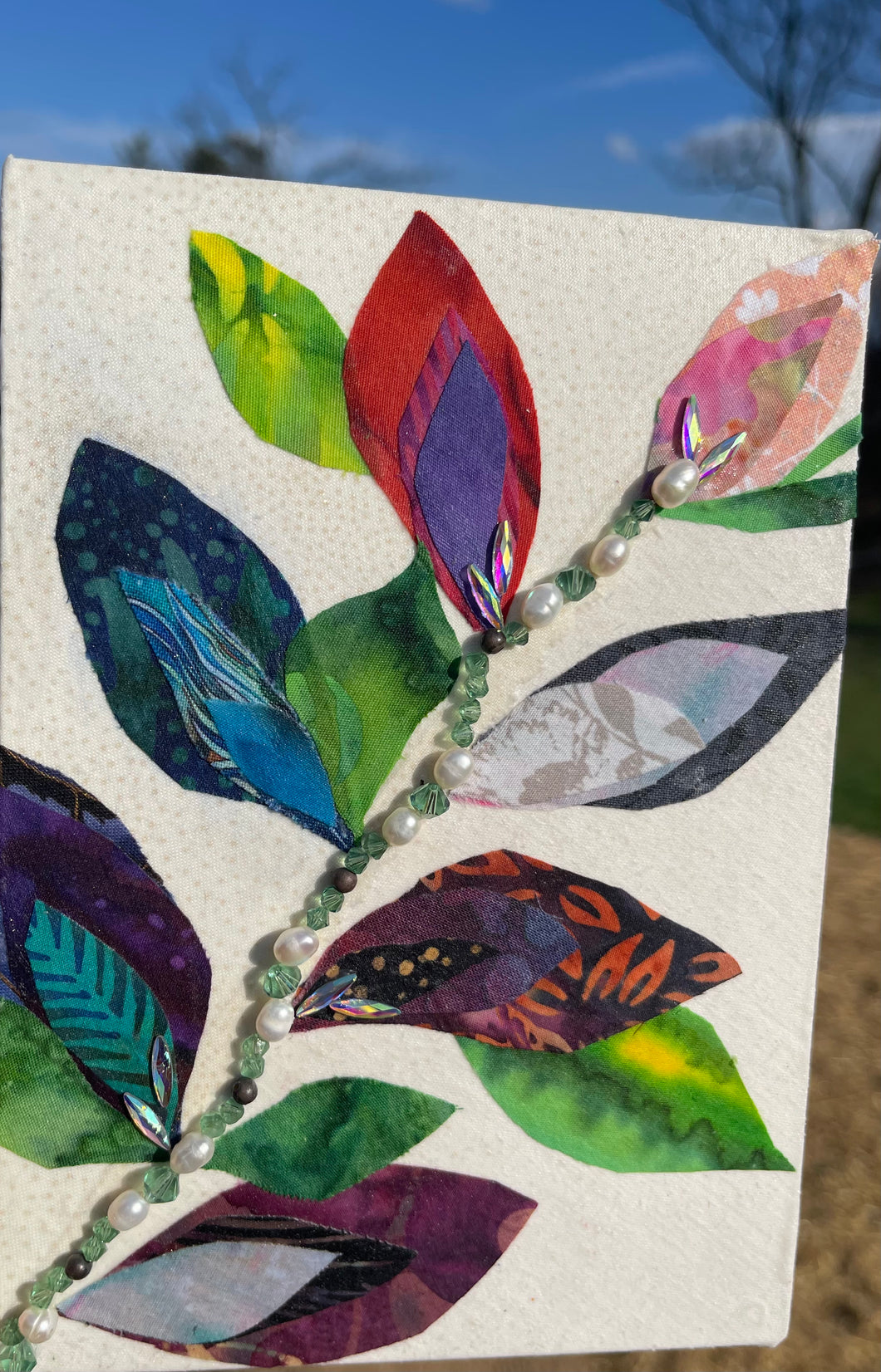 The Path It Takes is a textile mixed media artwork that reflects movement, growth, and the quiet unfolding of direction. A flowing line of beaded detail winds across the surface, guiding the eye through layered fabric leaves in varied tones and textures.
