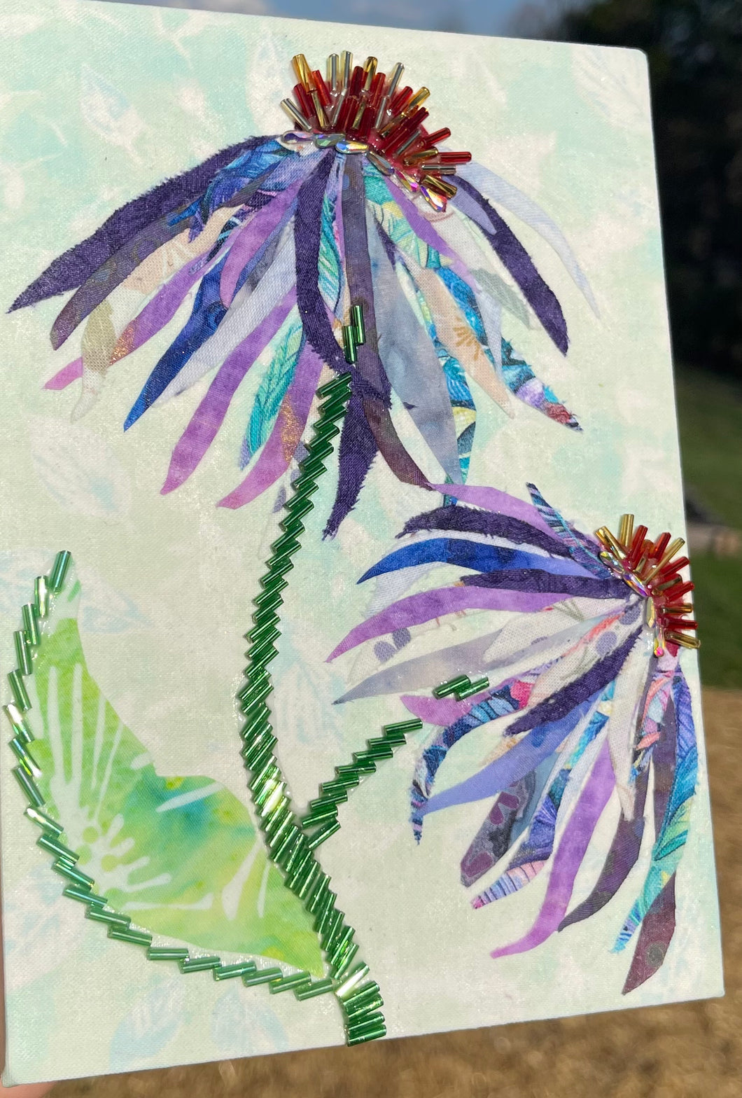 Where Light Drifts is a textile mixed media artwork that reflects softness, movement, and the quiet presence of light. Delicate floral forms emerge through layered fabrics, their petals gently unfolding in cool tones of violet, blue, and soft neutrals.