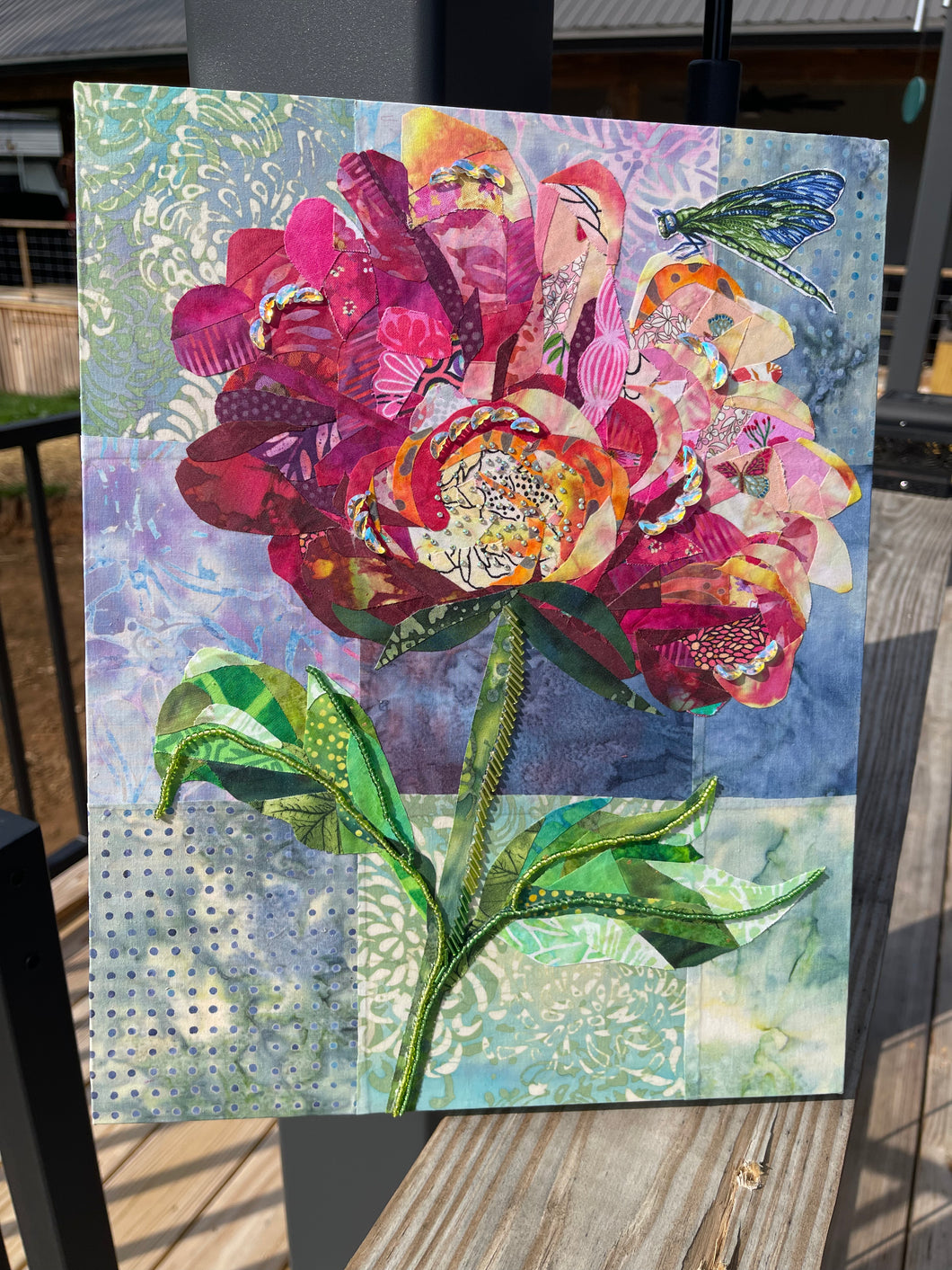 Where Light Lands is a textile mixed media artwork that reflects presence, movement, and the quiet beauty of fleeting moments. A richly layered bloom opens outward in vibrant color, its petals formed from fabric, stitching, and hand-applied embellishment that create depth and rhythm across the surface.
